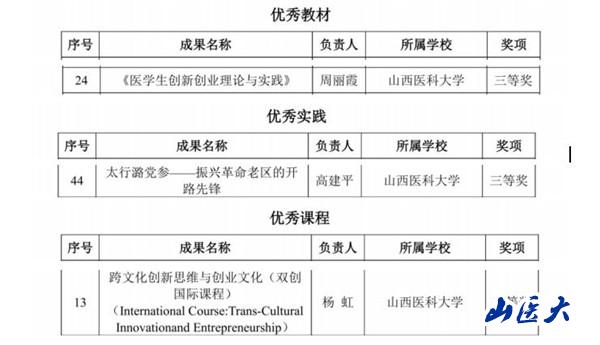 学校获评优秀组织奖,学校创新创业学院周丽霞副教授、人文学院吕雪梅讲师主编教材《医学生创新创业理论与实践》获“优秀教材”三等奖,药学院高建平教授团队项目太行潞党参——振兴革命老区的开路先锋获优秀实践三等奖,外语系杨虹讲师面向留学生开设的国际创新创业教育课程“跨文化创新思维与创业文化”(Trans-Cultural Innovation and Entrepreneurship)获优秀课程三等奖。