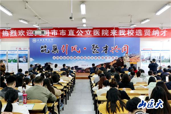 为进一步加强校地合作,深入开展2023年“书记校长访企拓岗促就业”专项行动,5月5日下午,我校在迎泽校区举办“筑巢引凤·聚才兴同”大同市校园招聘专场宣介活动。校党委副书记彭月兰,校党委常委、副校长刘春出席会议。大同市委组织部副部长郑天杰,大同市卫健委党组书记、主任纪青,大同市卫健委党组成员、副主任张晓琼,大同市第一人民医院党委书记、院长闫莉,大同市第二人民医院工作组组长杨波,大同市第三人民医院院长张宝成,大同市第四人民医院党委书记徐占有,大同市第五人民医院院长张强世,大同市中医医院党总支书记、院长姜世瑞等领导出席会议。校党委人才工作部、教务部、医院管理部、研究生学院、毕业生就业指导中心等相关部门负责人及200余名2023届应届毕业生参加会议。会议由毕业生就业指导中心主任郭建锴主持。