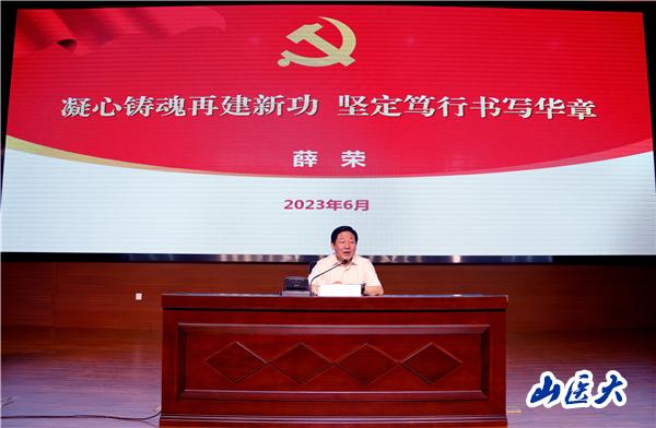薛荣强调,深入学习宣传贯彻党的二十大精神是当前和今后一个时期全党全国的首要政治任务。高校作为培养现代化建设人才的主阵地,推动党的二十大精神进校园进课堂具有十分重要意义。他指出,“两个确立”是新时代党和国家事业取得历史性成就、发生历史性变革的决定性因素,是新征程上战胜一切艰难险阻、应对一切不确定性的最大确定性、最大底气、最大保证。要深刻领悟“两个确立”的决定性意义,增强“四个意识”、坚定“四个自信”、做到“两个维护”,坚定不移在思想上政治上行动上同以习近平同志为核心的党中央保持高度一致,在新的赶考之路上继续创造令世人刮目相看的新奇迹。他用古今中外仁人志士的鲜活事例勉励山医学子,坚定信仰、志存高远,崇德向善、砥砺品行,勤于学习、敏于求知,甘于奉献、勇于奋斗,自觉用中华优秀传统文化、革命文化、社会主义先进文化培根铸魂、启智润心,勇于接过新时代的接力棒,把自己的命运融入伟大祖国和伟大时代,以“无我”的胸襟成就“大我”,在奉献和奋斗中唱响新时代的青春之歌,放飞最美好的青春梦想。