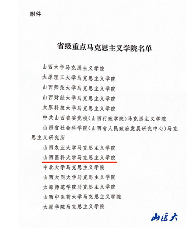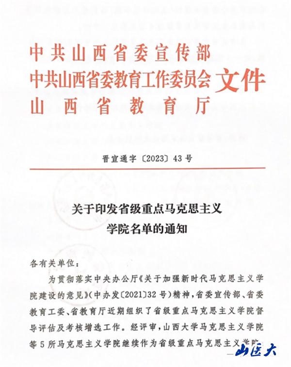 近日,中共山西省委宣传部、中共山西省委教育工作委员会、山西省教育厅联合下发《关于印发省级重点马克思主义学院名单的通知》(晋宣通字〔2023〕43号),我校马克思主义学院入选山西省重点马克思主义学院。