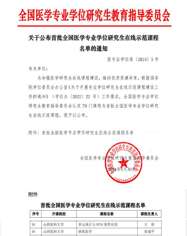 为落实教育部、国家发展改革委、财政部《关于加快新时代研究生教育改革发展的意见》精神,根据国务院学位委员会办公室《关于开展专业学位研究生在线示范课程建设工作的通知》要求,为推进教育数字化,完善医学专业学位研究生在线课程体系建设,促进医学研究生教育高质量发展,全国医学专业学位研究生教育指导委员会开展了首批全国医学专业学位研究生在线示范课程遴选工作。