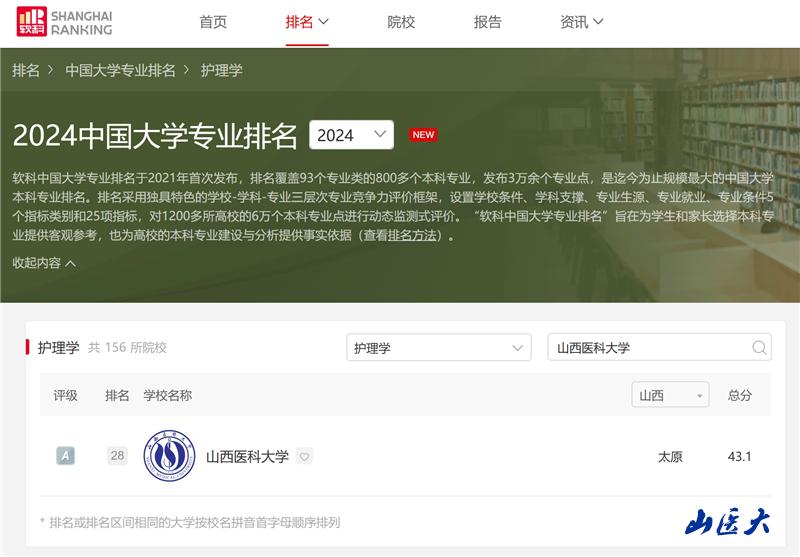 我校护理学专业在2024年软科中国大学专业排名中跻身A层次