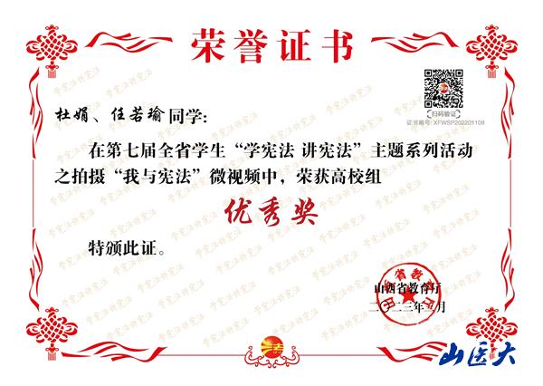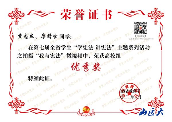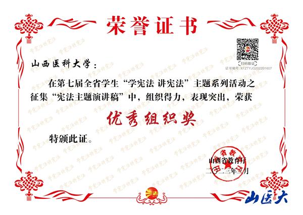 “学宪法讲宪法”主题系列活动是山西省教育厅每年组织的一项重要普法活动,也是我校面向广大师生进行法律宣传的主要活动内容。近日,山西省教育厅公布了在2022年全省教育系统的“学宪法、讲宪法”活动中表现突出的先进集体和个人,我校荣获优秀组织奖,基础医学院学生白京与指导老师李佳洁分获三等奖与优秀指导教师奖;护理学院学生张玲辉获宪法知识竞赛决赛优秀奖;另外,在“我与宪法”微视频活动中,第一临床医学院学生贾志杰、廖晴雪,儿科医学系学生杜娟、任若瑜分获优秀奖。