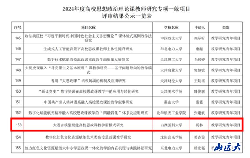 近日,教育部社科司公布了2024年度高校思想政治理论课教师研究专项一般项目评审结果。由我校马克思主义学院青年教师杨林主持的“大语言模型赋能高校思政课教学新模式研究”获批教学研究青年项目。此次“教学研究青年项目”全国共59项,杨林是山西省唯一此类项目获批者。这也是我校首次获批立项该类项目。