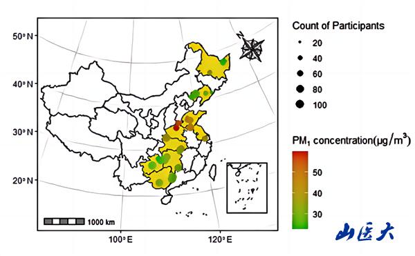 Figure 2 The map of participants’ locationss and 12-year average PM1 concentrations