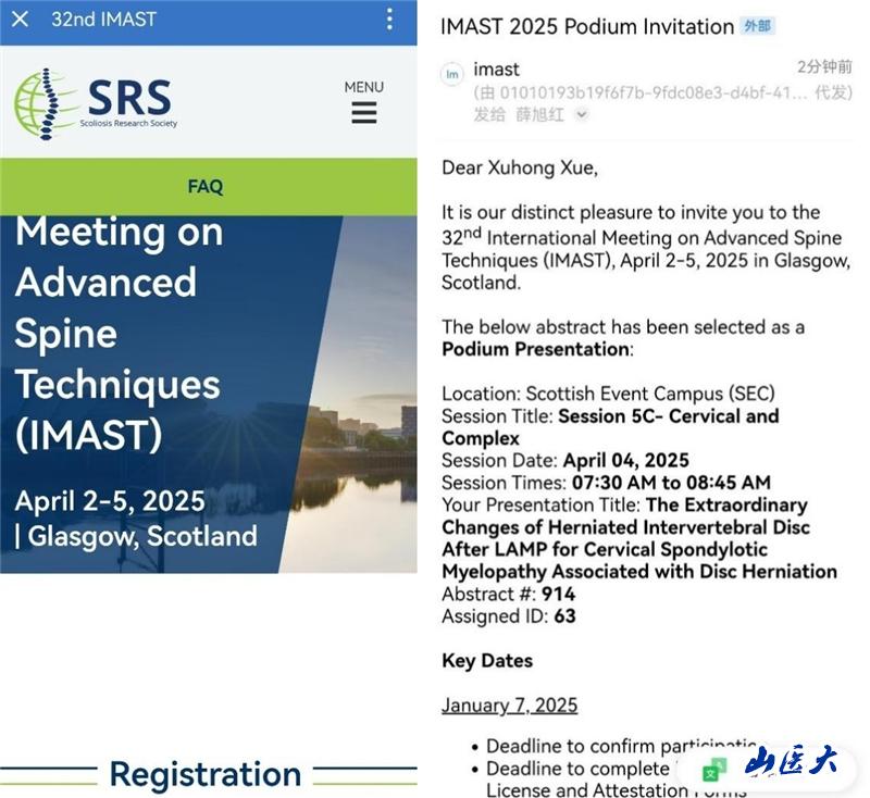 近日,第32届IMAST会议(国际脊柱先进技术会议)学术论文评选结果出炉,我校第二医院骨科脊柱畸形专业组薛旭红教授的1篇研究性学术论文入选,受邀在IMAST会议上作大会发言。