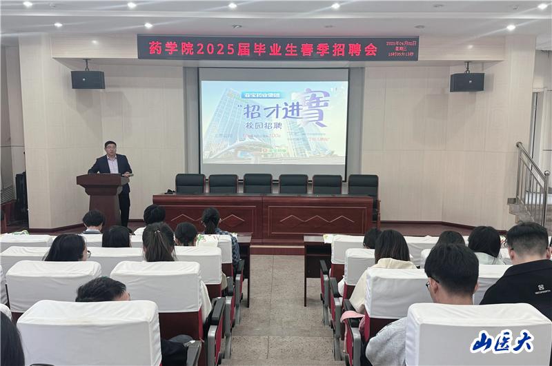 4月2日,我校药学院2025届毕业生春季招聘会在中都校区举办。亚宝药业和鲁南制药招聘负责人、药学院党委副书记童玲、药学院就业专员姜敏及2025届毕业生参会。