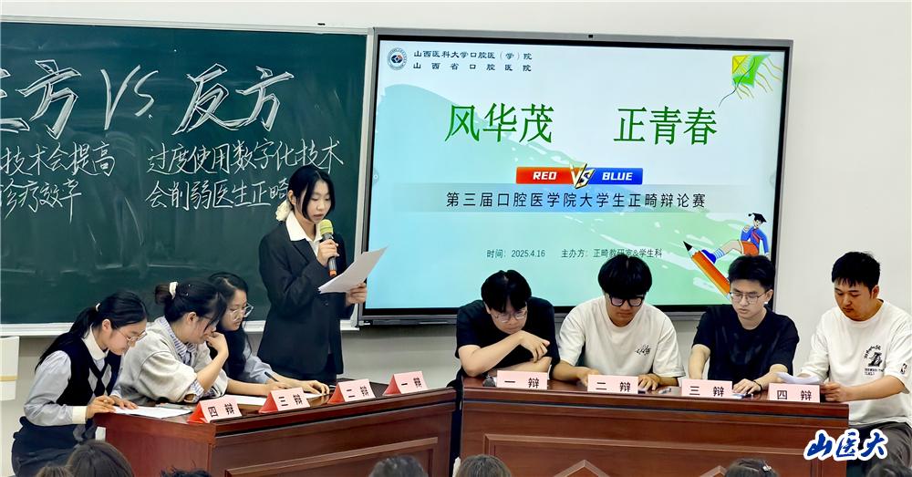 4月16日下午,我校口腔医学院第三届正畸辩论赛在口腔医院东院区拉开帷幕。本次辩论赛以“风华茂,正青春”为主题,围绕“数字化技术对医生诊疗能力的影响”展开激烈探讨。口腔正畸教研室多位教师、学生思想政治辅导员及现场学生共同参与评审,吸引了众多师生到场观摩。